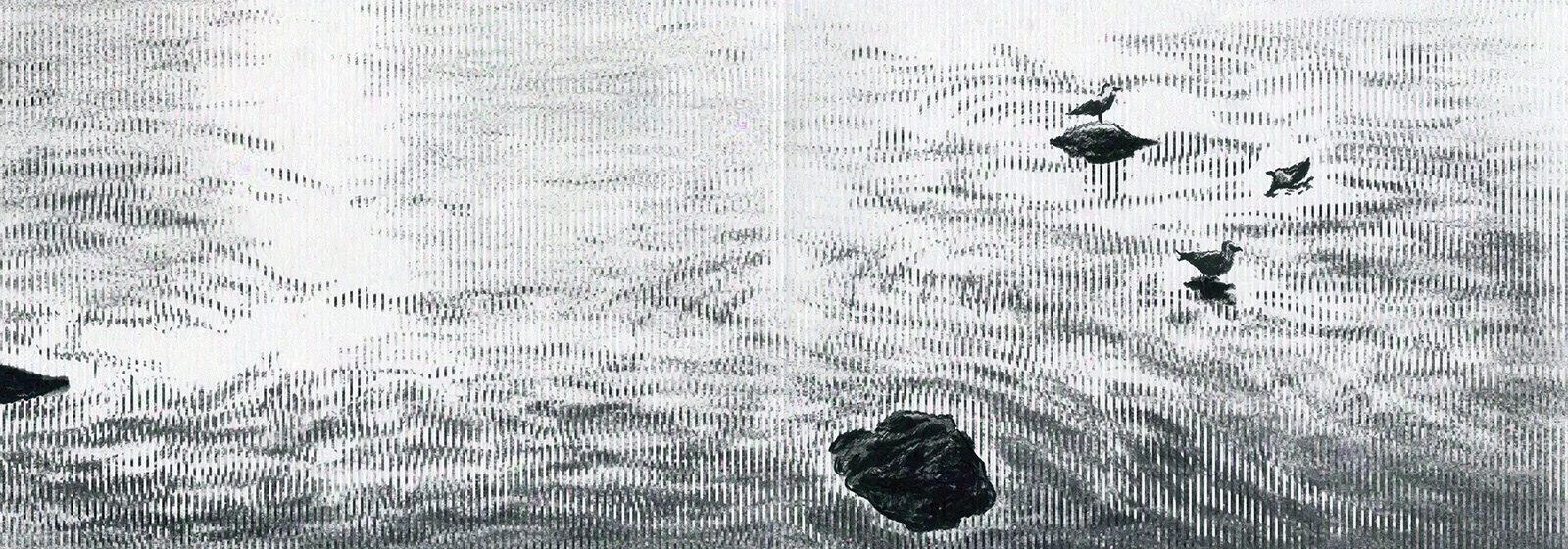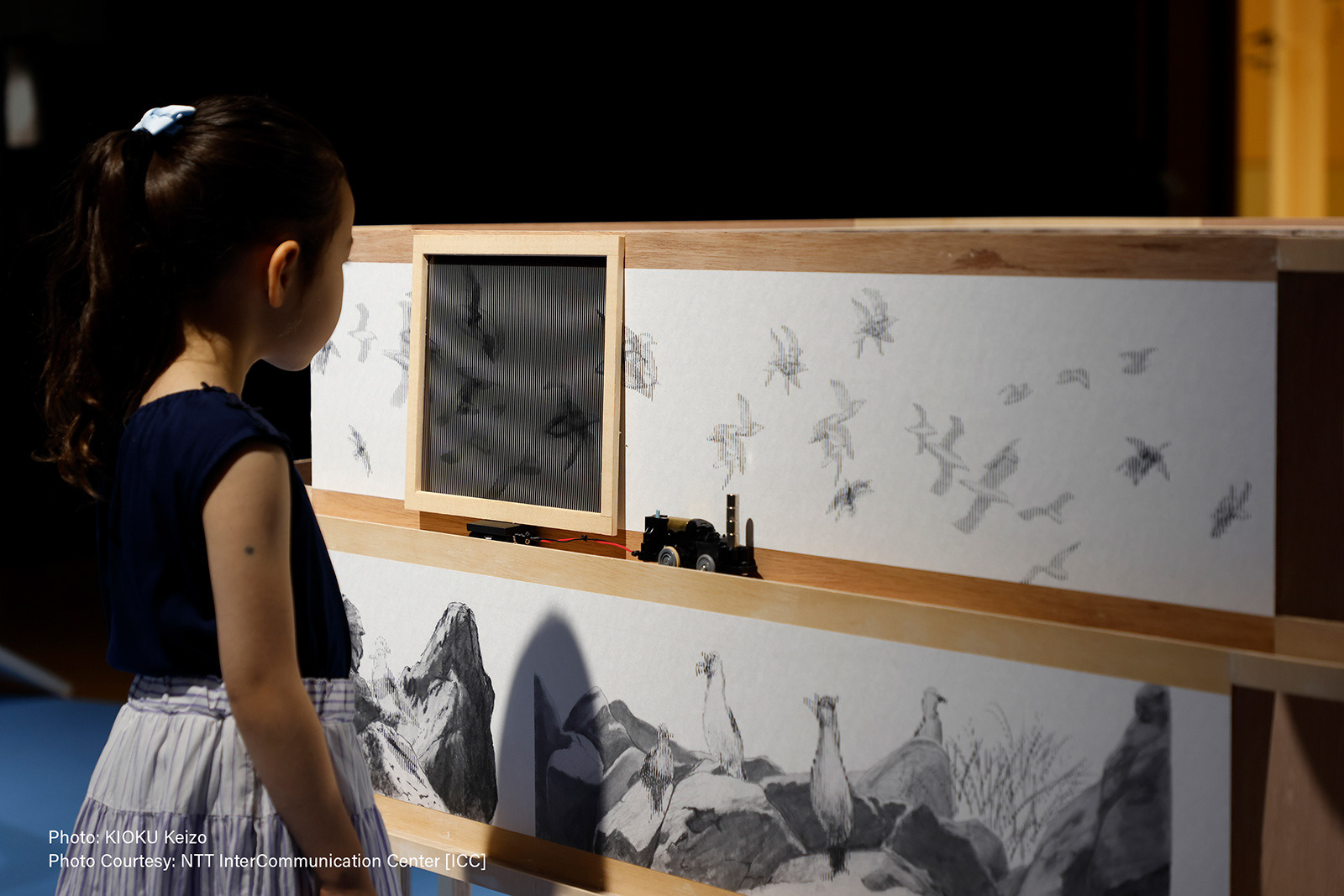 A fable of a fable ‹Black-tailed gull› is a kinetic installation that tells a narrative through Slit animation, a technique of moving images that employs an animation effect created by moving a striped transparent overlay across an interlaced image. As multiple self-driving slits slowly pass in front of the drawings, the drawings depicting various times and spaces begin to move respectively at different moments. They tell one narrative of black-tailed gulls living and dying in an expanse of time and space that branches out in numerous layers like a gradation. There is no beginning and no end, and while various things happen discretely in multiple times and spaces, the whole is connected. It is impossible to arrive at the narrative itself simply by looking at the whole or by following the events that are happening individually. The structure of this narrative overlaps with the physical structure of the installation.